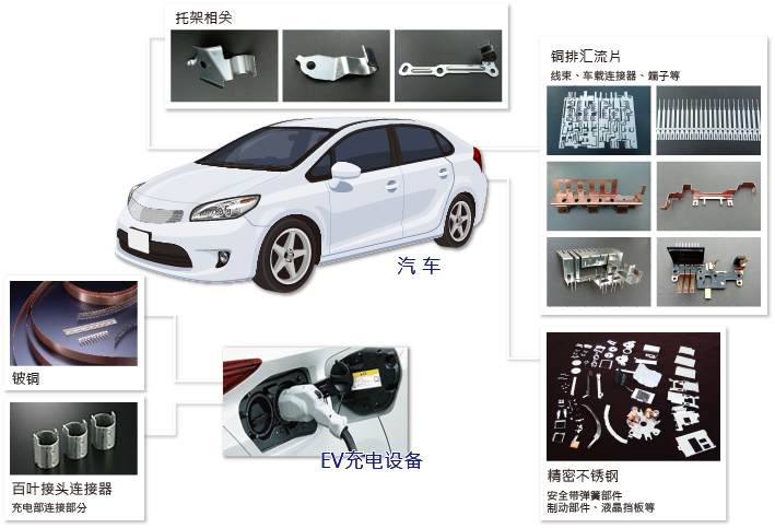 此外,本公司還在為今后有發(fā)展?jié)摿Φ男履茉雌嚨碾娧b系統(tǒng)(線束、車載連接器端子)中所使用的不銹鋼、 鋁、銅合金和電鍍材料等方面提供廣泛的供應。利用本公司的加工基地,也可以供應母線和鑲件成形品。